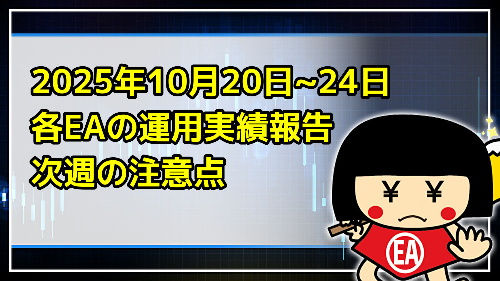 このページでは、錬☆金太郎が無料配布をしているEAの、10月20日~24日の稼働実績をご報告致します。EA利用の申し込み、個別のご質問やご相談はLINEへお願い致します。 2025年10月27日~31日週で注意したいこと 錬☆金太郎は毎月末2日は稼働停止推奨としていま... -