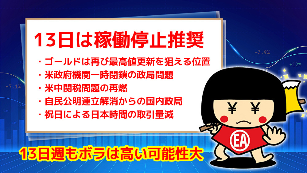 資金管理を徹底された上で、いつもよりロットを落とす、時短運用などのリスク対策をされること推奨します。