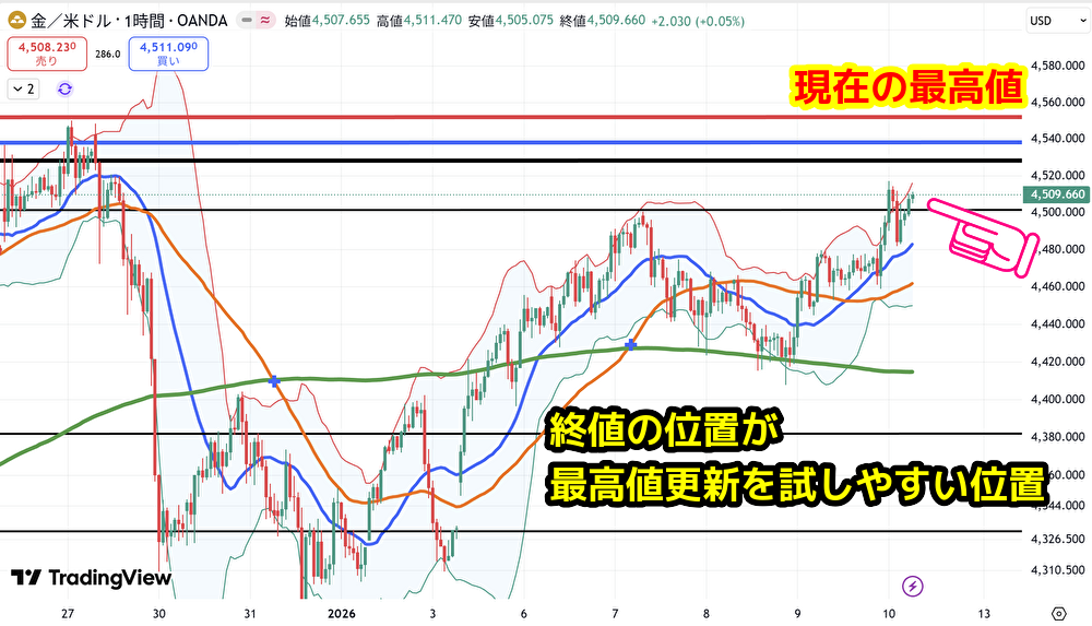 直近の値動きを見る限り、相場はまだ上方向への意識が非常に強く、特に9日〜10日にかけて、最高値更新を十分狙える位置で取引を終えている点は要注意です。