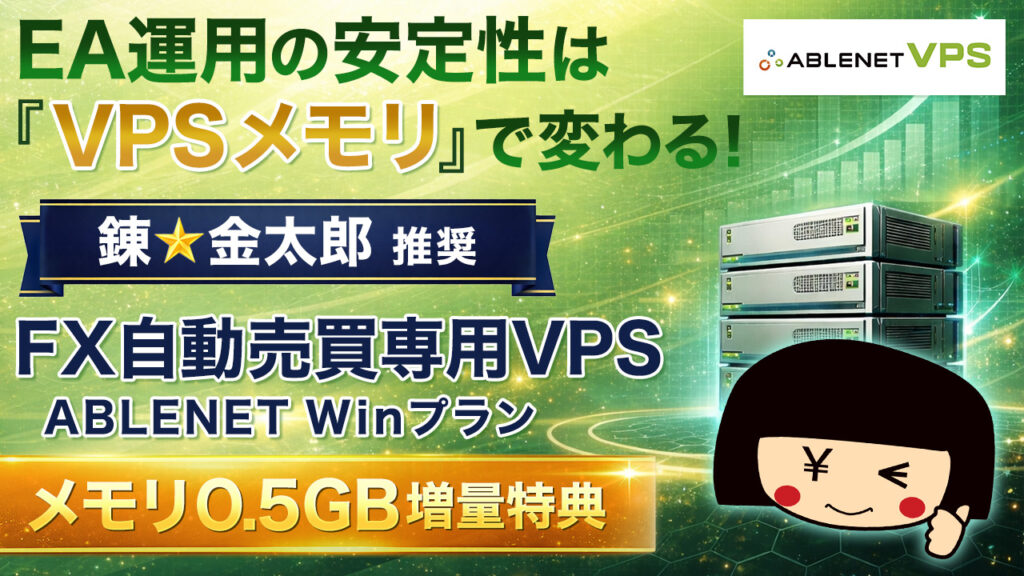 この度、FX自動売買向けVPSで国内最大手の「ABLENET」さんから、VPS環境を物理的によりよくする特典「メモリ0.5GB増量」を頂いて提携することになりましたので、ご案内致します。