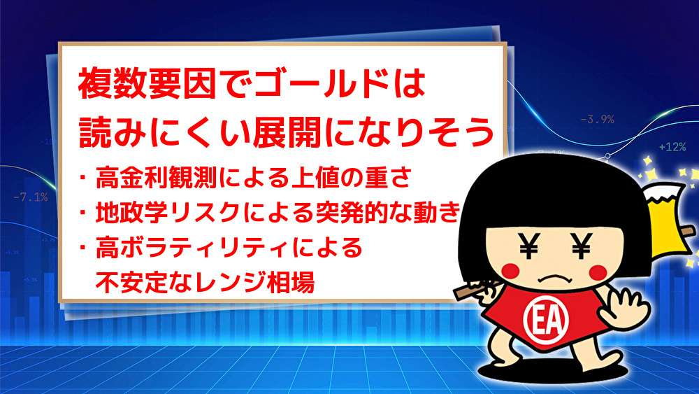 FOMC通過後もインフレの粘着性が意識されており、金利が高止まりするとの見方が継続しています。これはゴールドにとっては逆風要因となりやすく、上昇しても伸びきらず、戻り売りが入りやすい展開になりやすいです。