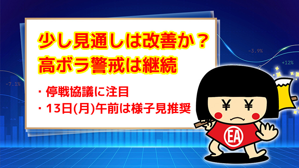 さしあたり、11日からの協議の一定の方向性が出ていると思われる中で取引が再開される13日(月)の午前中は様子見推奨です。