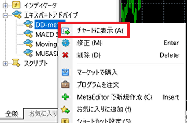 1つは「ナビゲーター」に表示されているEA名をドラックしてチャートの上までもっていく方法、もう1つは「ナビゲーター」に表示されているEA名の上で右クリックをして「チャート表に表示」を選択してクリックする方法です。