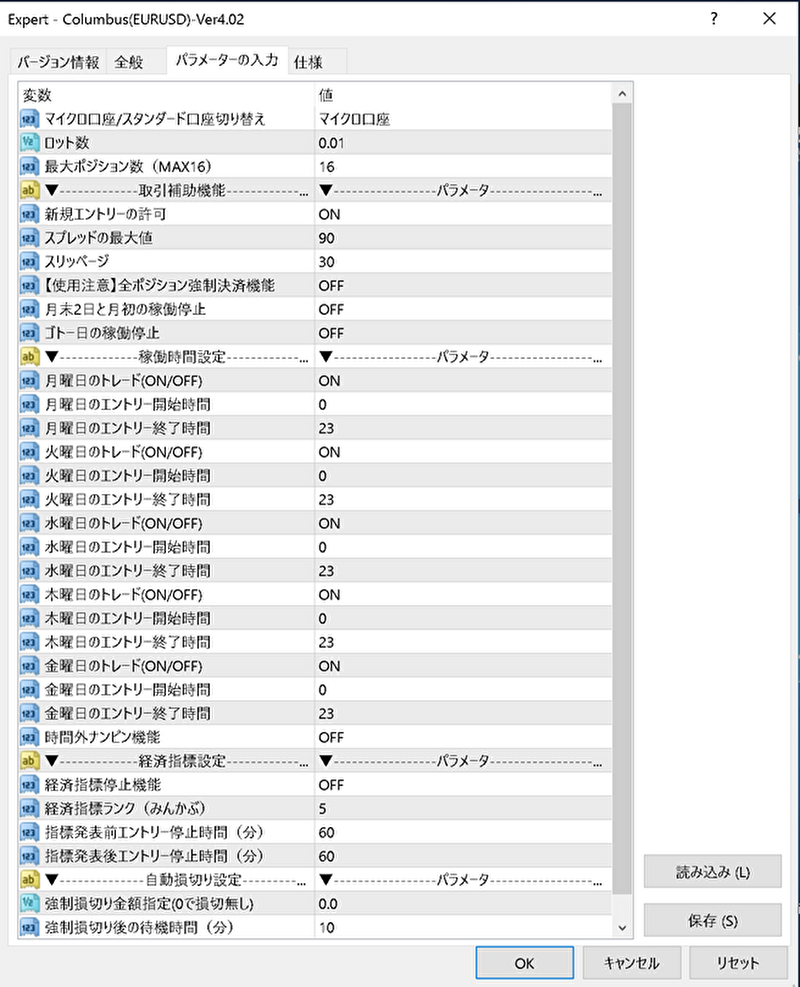 下の画像がコロンブス(Ver4.03)のパラメーター全体像になります。上から順番に設定を解説します。※(Ver4.02)と表示は全く一緒