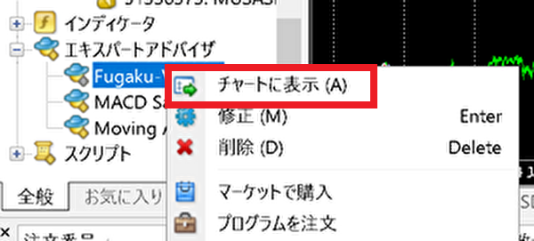 1つは「ナビゲーター」に表示されているEA名をドラックしてチャートの上までもっていく方法、もう1つは下記画像の様にEA名の上で右クリックをして「チャート表に表示」を選択してクリックする方法です。