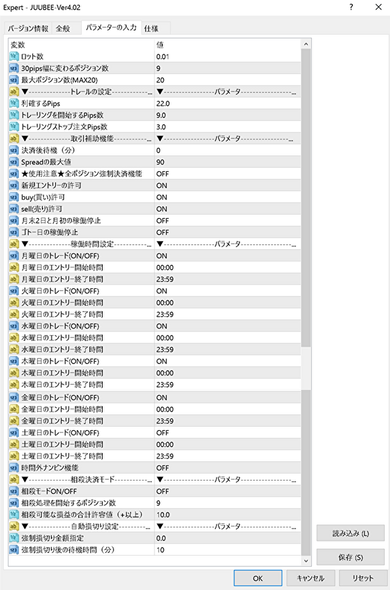 ・パラメーター設定後(変更後)はMT4再起動を実施
