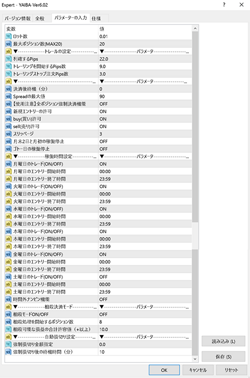 (Ver6.02)ですが、ユーザー様から多数のご要望を受けて(Ver6.01)を微調整しただけなのでアップデート内容は変わりません。調整部分は、日本時間表記に変更をしたことから週の取引終了時間が日本時間の土曜日早朝になるので、念の為、取引停止時間まで稼働できる様にしたことです。