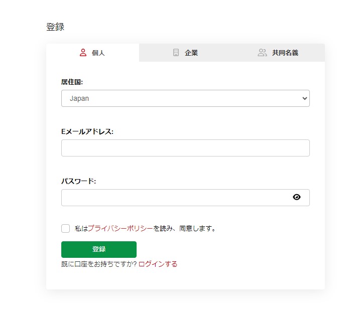 居住国、Eメールアドレス、パスワードを入力するだけで、簡単にアカウント開設が出来ます。