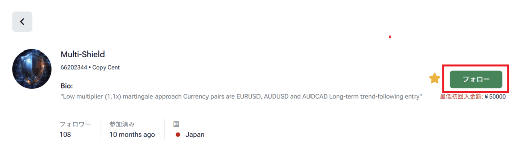 先にアカウントにログインをした状態で、上記リンクボタンから「Multi-Shield」のストラテジープロバイダーリストに飛んでください。
