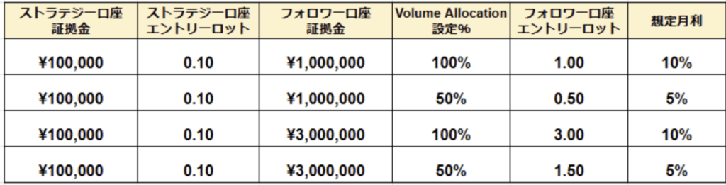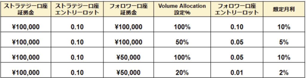 設定の基本として、運用元口座と同じように運用したい場合はVolume Allocationを100%にすると同じ利益率での運用となります。